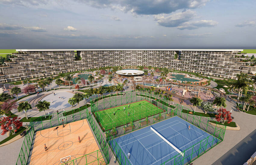 Located on a 36,000 sqm plot, the project features 406 apartments with layouts ranging from 45 sqm to 214 sqm. The project also features an outdoor pool, an indoor pool, children's playgrounds for different age groups, soccer and basketball courts, tennis courts, a gym, sauna, Turkish bath, a movie theater, an indoor parking garage, and an electric vehicle charging station.